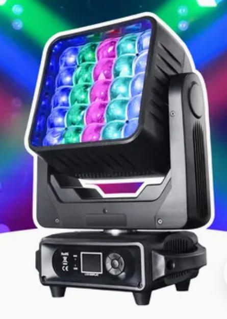 Professional LED matrix moving head light featuring 25×15W RGBW 4-in-1 LEDs, combining shaking head, dyeing, and focusing functions for dynamic stage and dance lighting effects.