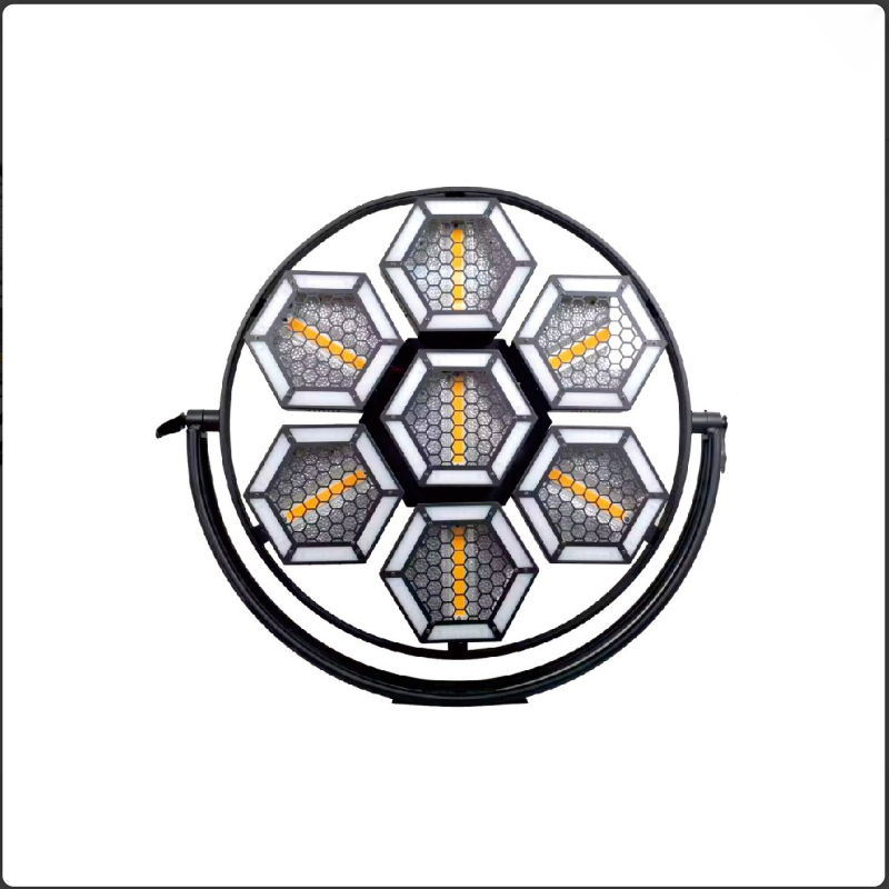 | Light Source | Main: 7 × 60W COB (Cool/Warm White) Aux: Inner + Outer RGB rings (168+1008 SMD LEDs) Type: 3in1 (Wash + Strobe + Background Pixel) |